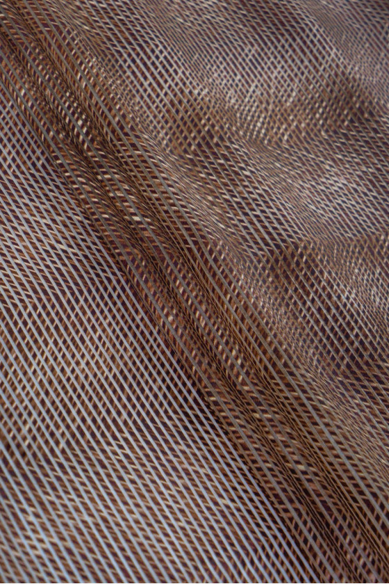 Olasz organza szövet váltakozó csíkokkal - átlátszó és átlátszatlan, 0,5 cm széles. Cikk-cakk motívum barna-bézs színben. Az átlátszó öv természetes selyemből szőtt, míg az átlátszatlan poliészterből készül.