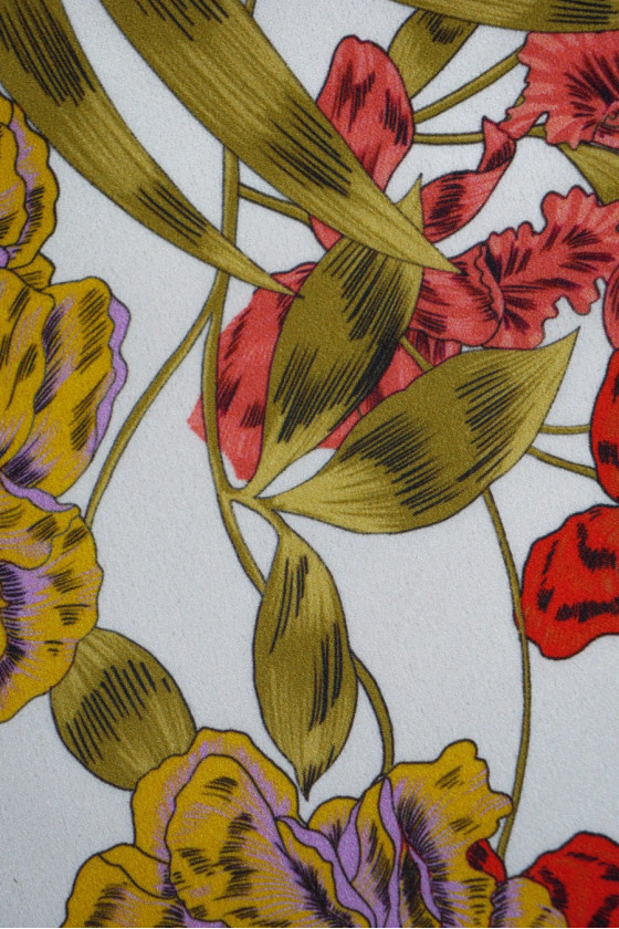 Olasz selyem krepp piros és sárga virágokkal szürkészöld alapon, az egészet olajfalevelek egészítik ki. A selyem krepp finom, vékony, félig matt anyag. Használható légies ruhák, finom blúzok, sálak, sálak elővarázsolására.