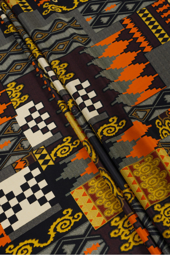 Olasz selyem szatén etnikai motívumokkal a következő színekben: barna, fekete, piros, bézs. Stretch, puha, áramló szövet - a nyomtatás a szövet matt oldalán történik