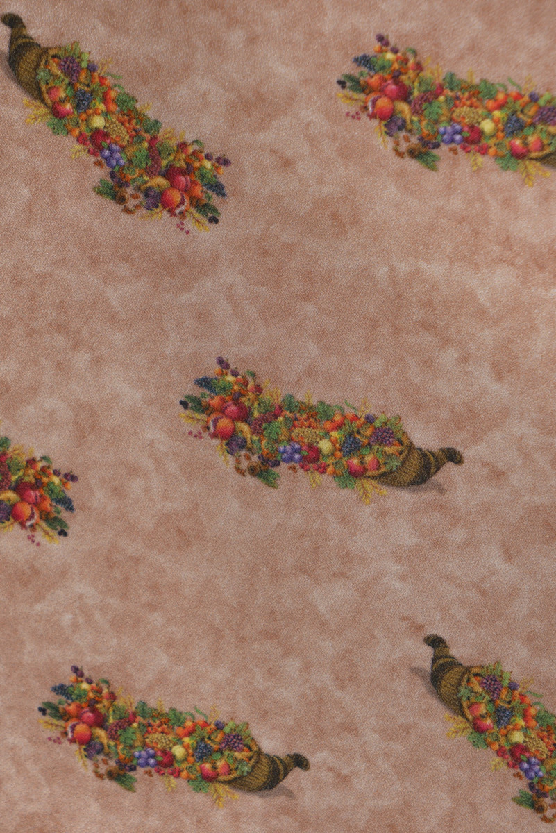 Olasz krepp 100% selyem, "Cornucopia" motívummal (6 cm) bézs alapon. A selyem krepp finom, vékony, félig matt anyag.