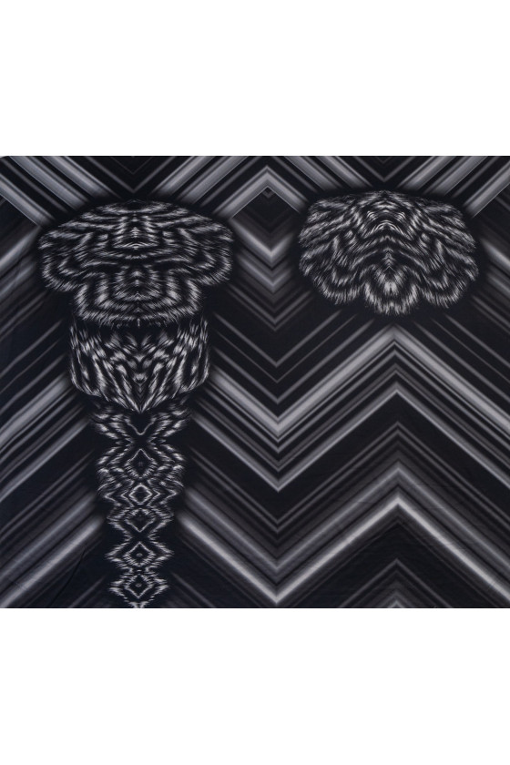 Olasz 100% selyem krepp 125 cm* 140 cm-es kuponméretben. Szövet eredeti motívummal, szürke és fekete színben. A selyem krepp finom, vékony, félig matt anyag.