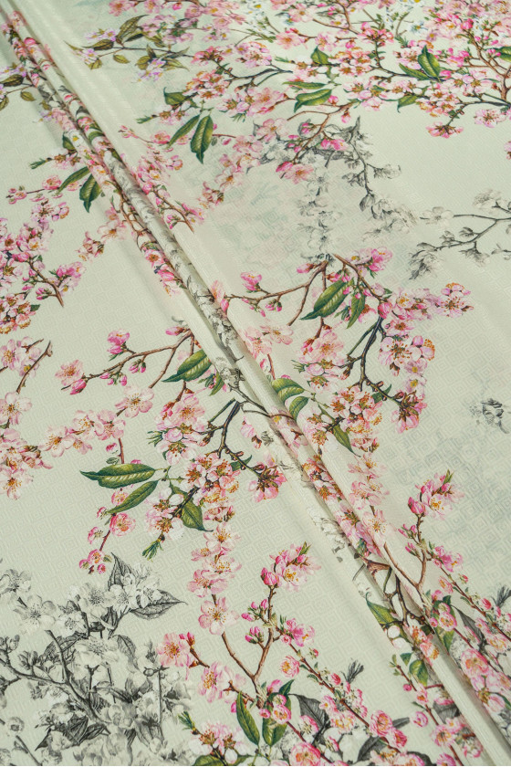 Gyönyörű olasz 100% selyemszövet bézs és olíva színben, gallymotívummal, cseresznyevirágokkal, szürke és rózsaszín színben. Nagyon eredeti jacquard szövésű szövet matt-fényes kocka formájában. Nem rugalmas, könnyű, átlátszatlan anyag, finom ragyogással - tökéletes elegáns ruha, blúz, szoknya vagy kendő varrásához.