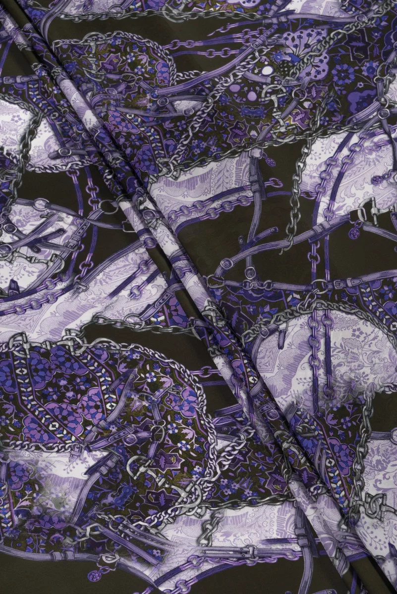 Olasz, vastagabb sifon 100% selyem, szürke és lila láncok motívumával, nagyon sötétzöld alapon. A természetes selyemből készült sifon nagyon finom, tágas, enyhén átlátszó anyag. Tökéletes tágas ruhákhoz és blúzokhoz. Nem rugalmas anyag.