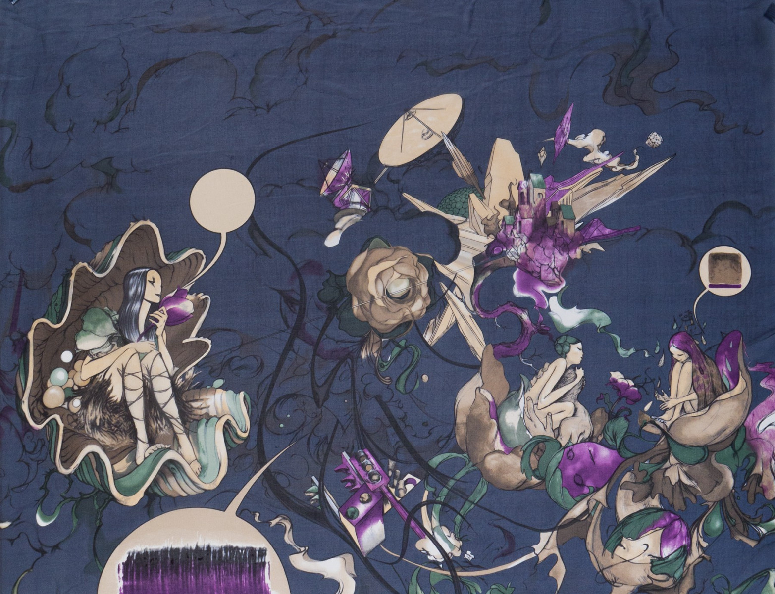 Olasz 100% selyem organza szövet 135 cm*140 cm-es kuponméretben. A grafit háttéren fantáziadús karakterek gyönyörű motívuma, egy jól ismert divatház nevével aláírt szövet.
