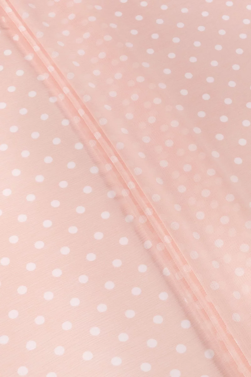 Olasz sifon 100% selyem, gyűrött (gyűrött) szerkezetű, világos rózsaszínű, fehér pöttyökkel. A szövetet ezüst lurex szál díszíti. A természetes selyemből készült sifon nagyon finom, tágas és átlátszó anyag. Tökéletes tágas ruhákhoz és blúzokhoz. Enyhén rugalmas anyag.