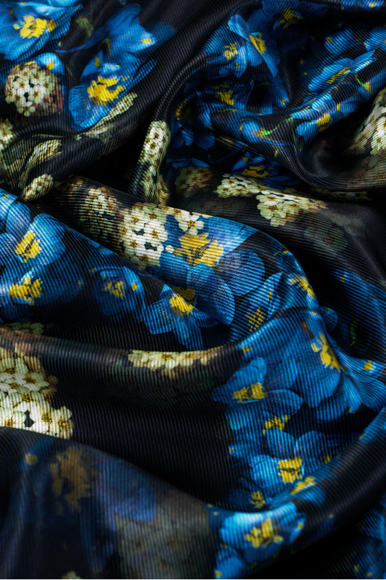 Olasz selyem twill szövet kuponméretben 125cm * 140cm. Szövet nagy virágmotívummal, écru és kék fekete alapon. Az anyag puha, vékony, de átlátszatlan, könnyű - tökéletes ruha, szoknya vagy kendő varrásához.
