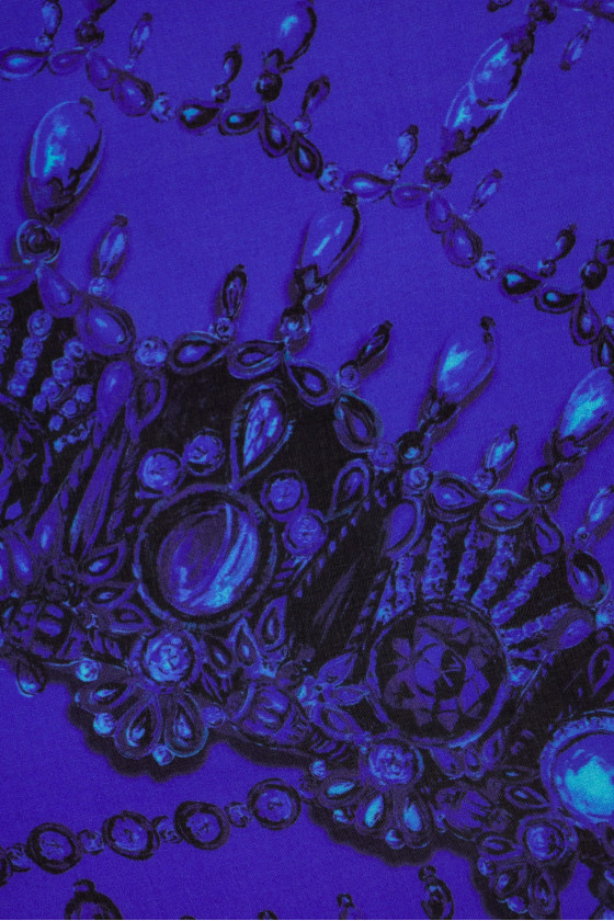Olasz muszlin 100% selyem 135 cm* 140 cm méretű kuponban. Gyönyörű ékszermotívum fekete és búzavirág sál formájában.