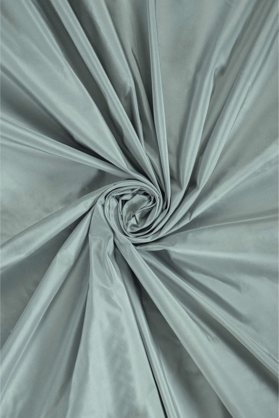 Olasz 100% selyem taft szövet szürke színben. A természetes selyem taft vékony, de merev anyag, finom fényű, a selyemszövetekre jellemző.
