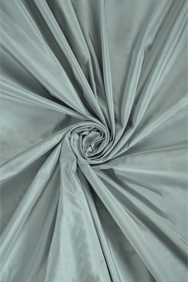 Olasz 100% selyem taft szövet szürke színben. A természetes selyem taft vékony, de merev anyag, finom fényű, a selyemszövetekre jellemző. Tökéletes ruha, szoknya varrására vagy dekoratív célokra.