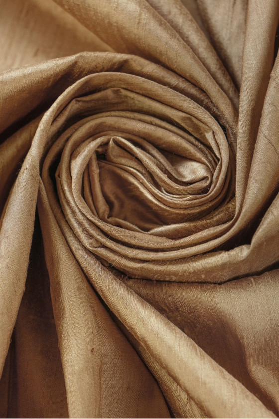 Olasz 100% shantung selyemszövet arany bézs színben. A Shandung egyfajta puha selyemszövet, amely nyers fonalból készül, jellegzetes, szabálytalan eloszlású, csomós vastagításokkal (díszesen szálas fonal) a vetülékben. Enyhén merev, műanyag szerkezetű.