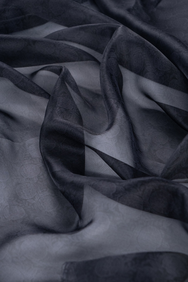 Olasz 100% selyem organza szövet fekete színben, szürke virágok motívumával. A természetes selyemorganza vékony, átlátszó, de merev anyag, finom ragyogással, amely a selyemszövetekre jellemző.