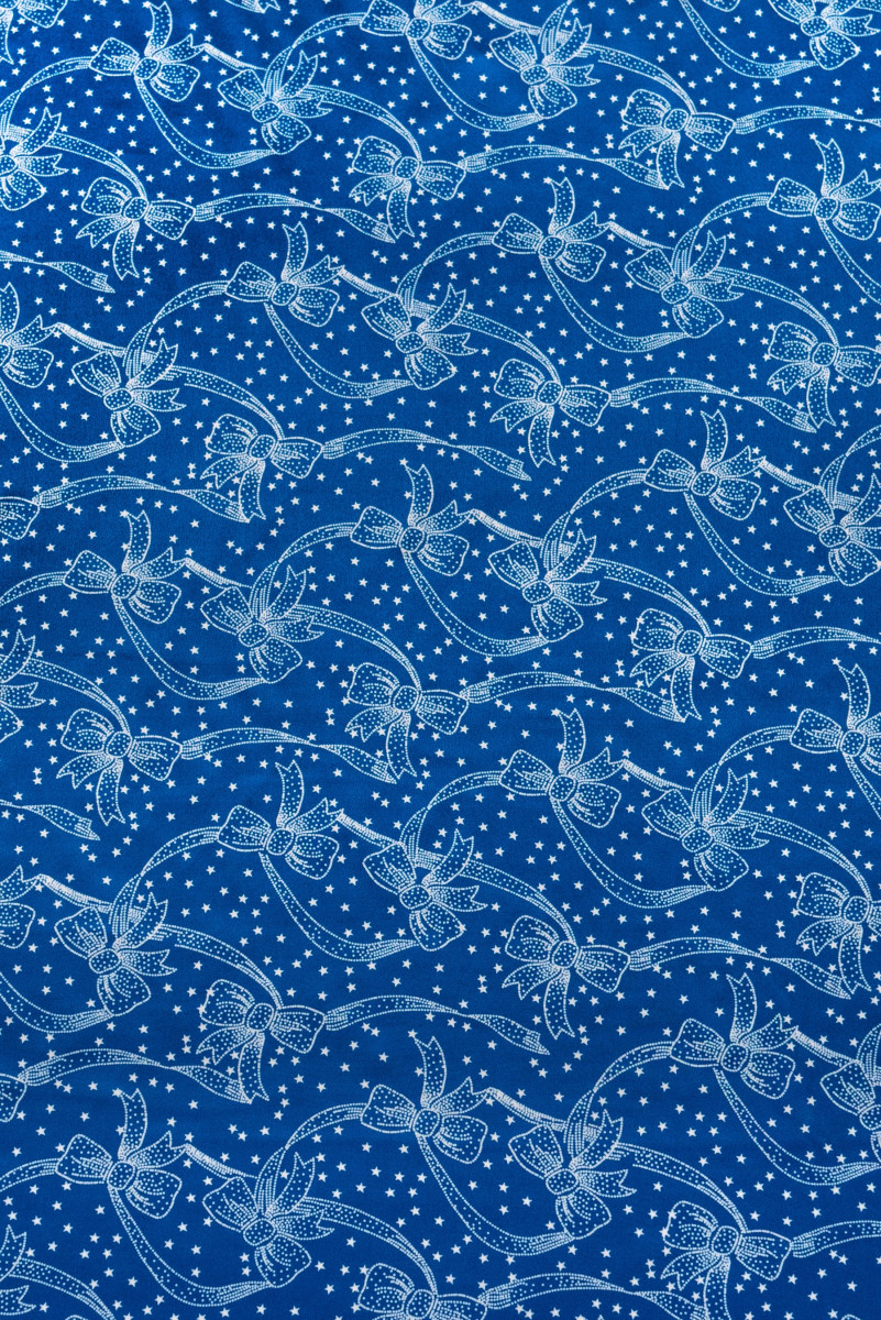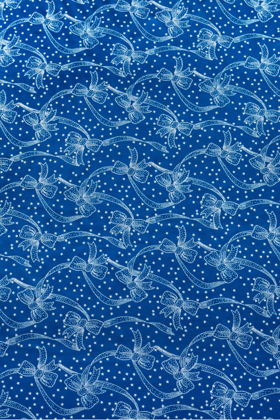 Olasz 100% selyem szatén kék színben, szürke és fehér masnik és kis csillagok motívumával. A selyemszatén sűrű és könnyű, sík felületű, szatén szövésű anyag.