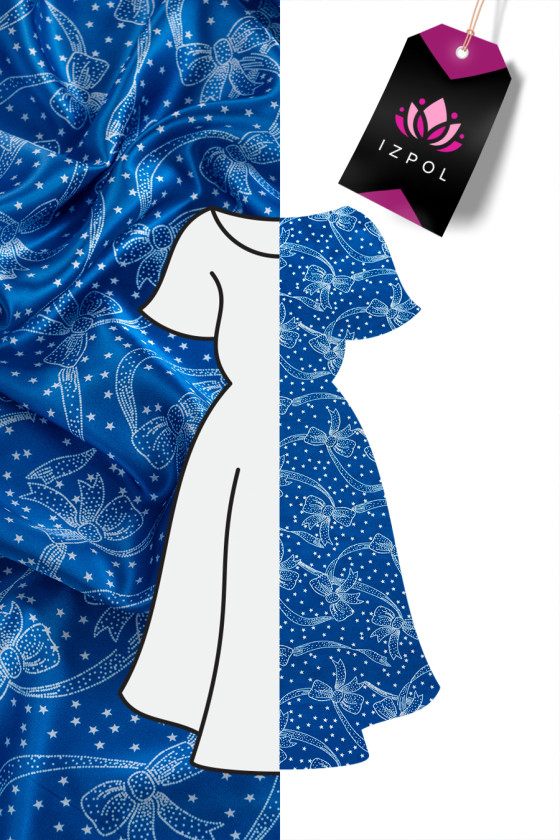 Olasz 100% selyem szatén kék színben, szürke és fehér masnik és kis csillagok motívumával. A selyemszatén sűrű és könnyű, sík felületű, szatén szövésű anyag. További előnye a simaság és a tartósság, valamint az a tény, hogy nagyon jól illeszkedik, nem jelenik meg és kellemes tapintású. Egyrészt matt, másrészt nemesen fényes. Használható légies ruhák, finom blúzok, szoknyák, sálak, sálak elővarázsolására.