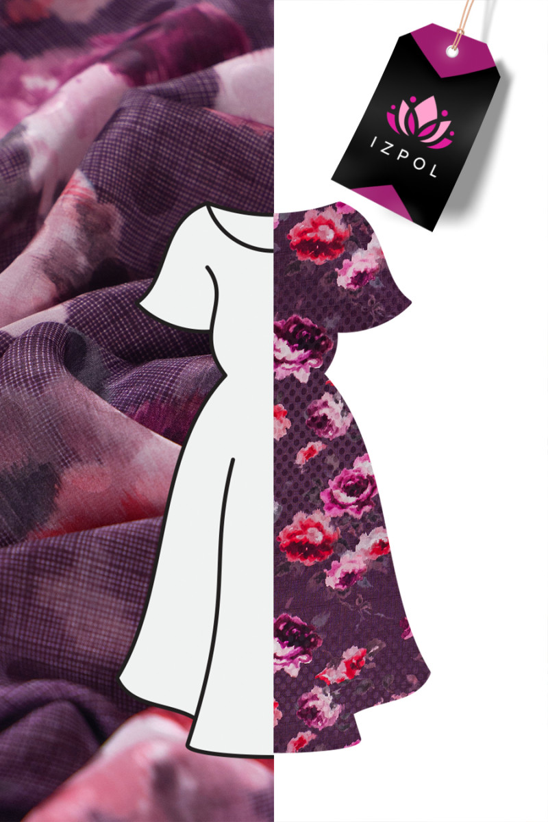 Olasz 100% selyem krepp jacquard szövéssel, szatén pöttyökkel, sötétlila anyaggal, festett, színes virágok motívumával. A selyem krepp finom, vékony, félig matt anyag. Puha tapintású és nagyon jól illeszkedik. Használható légies ruhák, finom blúzok, szoknyák, sálak, sálak elővarázsolására.