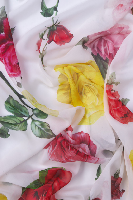 Olasz sifon 100% selyem krém színű, rózsaszín, piros és sárga rózsavirág motívummal. A selyem sifon vékony, átlátszó, matt, könnyű és tágas anyag. Tökéletes ruha, blúz, szoknya vagy kendő varrásához.