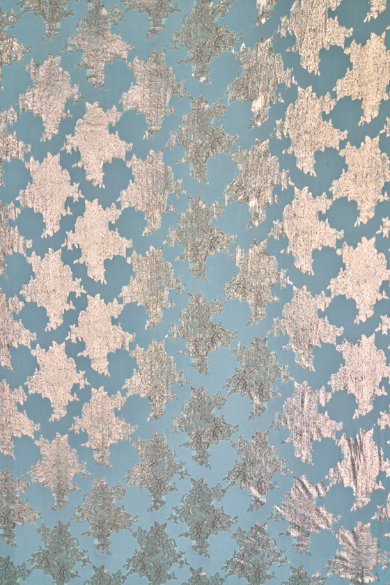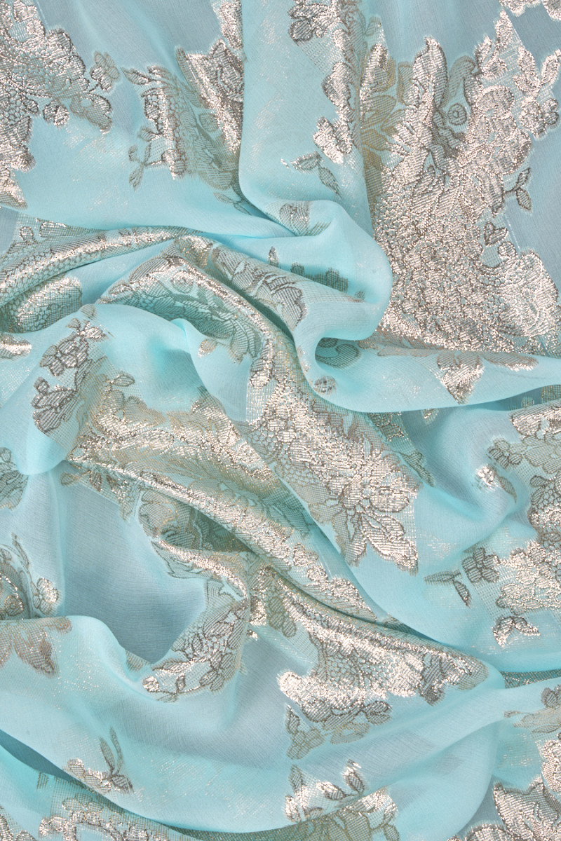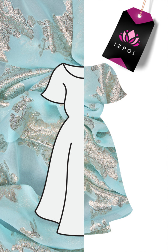 Olasz sifon 100% selyem, kék-türkiz színű, arany, jacquard virágok motívumával, lurex szálból (kb. 20 cm). A sifon vékony, átlátszó, matt, könnyű és tágas anyag. Tökéletes ruha, blúz, szoknya vagy kendő varrásához.