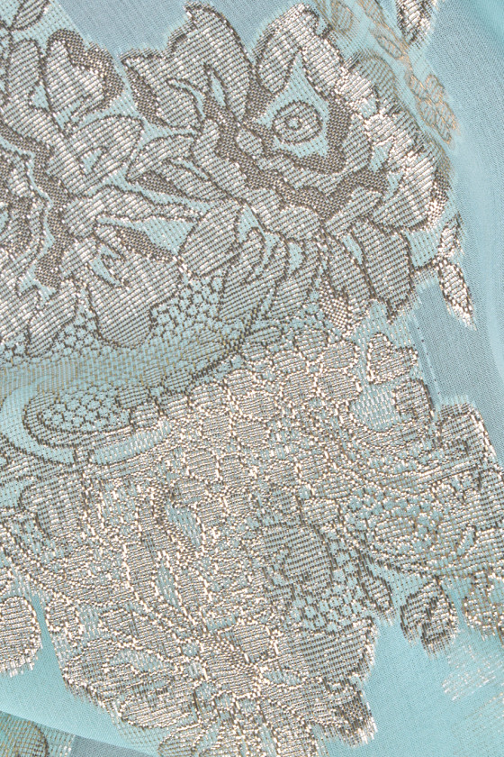 Olasz sifon 100% selyem, kék-türkiz színű, arany, jacquard virágok motívumával, lurex szálból (kb. 20 cm). A sifon vékony, átlátszó, matt, könnyű és tágas anyag.