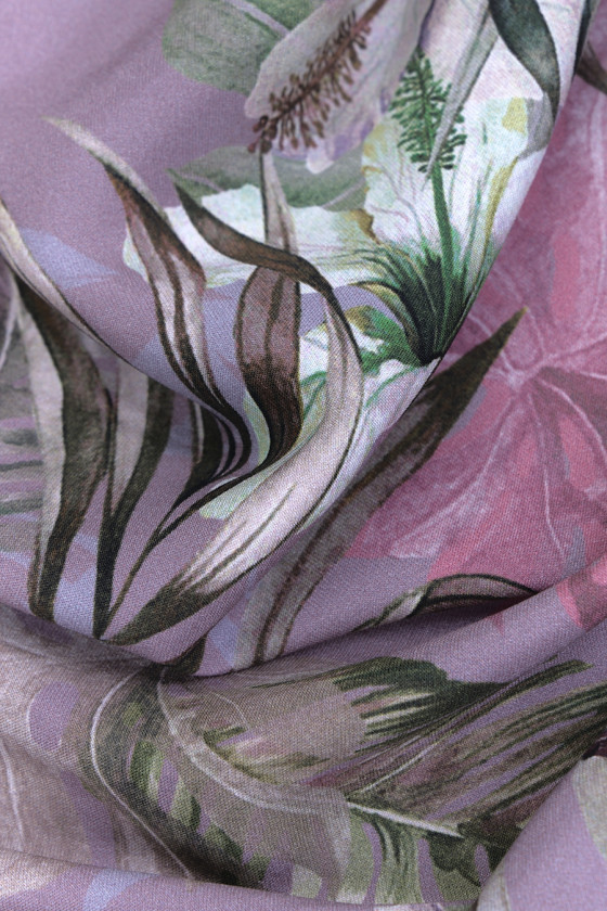 Olasz selyem szatén, rugalmas, gyönyörű virágmotívummal. A piszkos rózsaszín és elnémított lila háttéren zöld pálmalevelekkel körülvett krémszínű liliomvirágok mintáját nyomtatták - a nyomtatás matt oldalon készült. Az egészet nagyon visszafogott színekben tartják, így ez a szövet tökéletes elegáns kirándulásokhoz, például áldozáshoz vagy esküvői szertartáshoz.