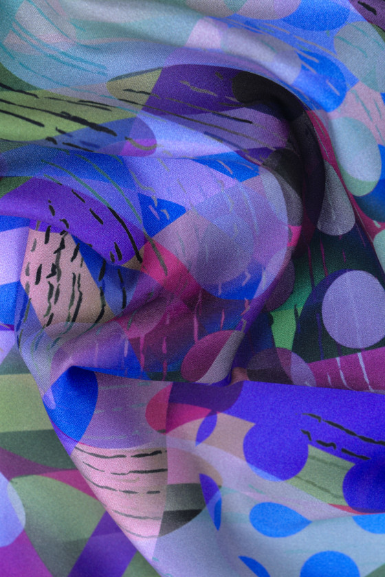 Olasz selyem szatén, rugalmas, "őrült" geometriai motívummal. Többek között a különböző minták láthatatlan kombinációja. A pontok, átlós csíkok és hullámok nagyon érdekes "rendetlenséget" hoznak létre. Az egészet fekete, búzavirág, lila és zöld színben tartják - a nyomtatás matt oldalon készült. Fantasztikus ajánlat egy érdekes ing vagy ruha varrására.