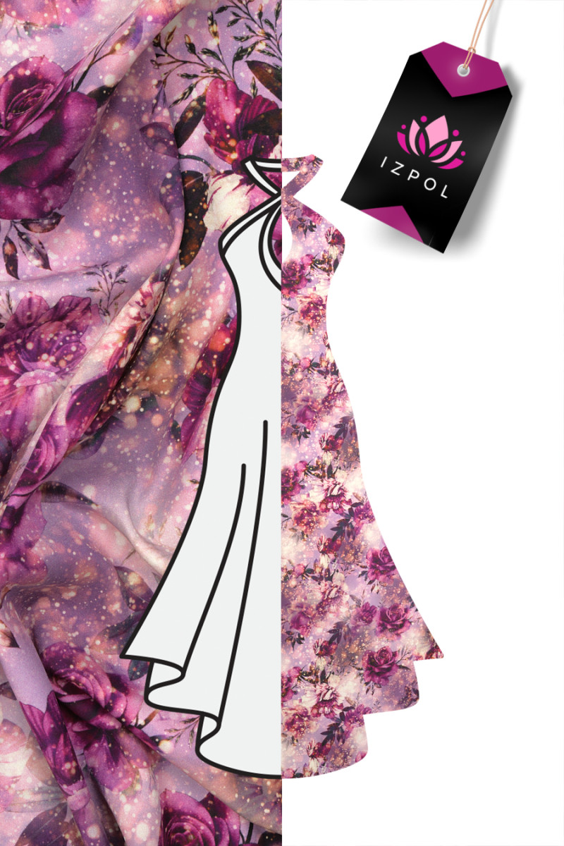Olasz selyem szatén elasztán hozzáadásával, matt oldalon készült nyomtatással. Gyönyörű, sűrű motívum rózsavirágok lila színben, fekete és krém akcentussal. Az egész árnyékos, lila-krém alapon készül, apró pontokkal, amelyek hasonlítanak a hóra. Fantasztikus ajánlat azok számára, akik szeretik a nyugodt színű virágmotívumokat. Ez az anyag tökéletes ruha, szoknya vagy gyönyörű ing varrásához.