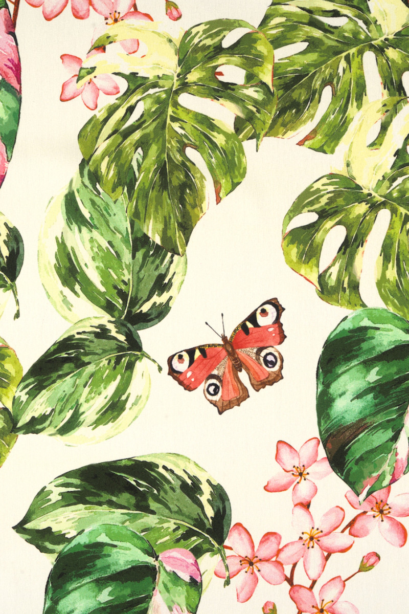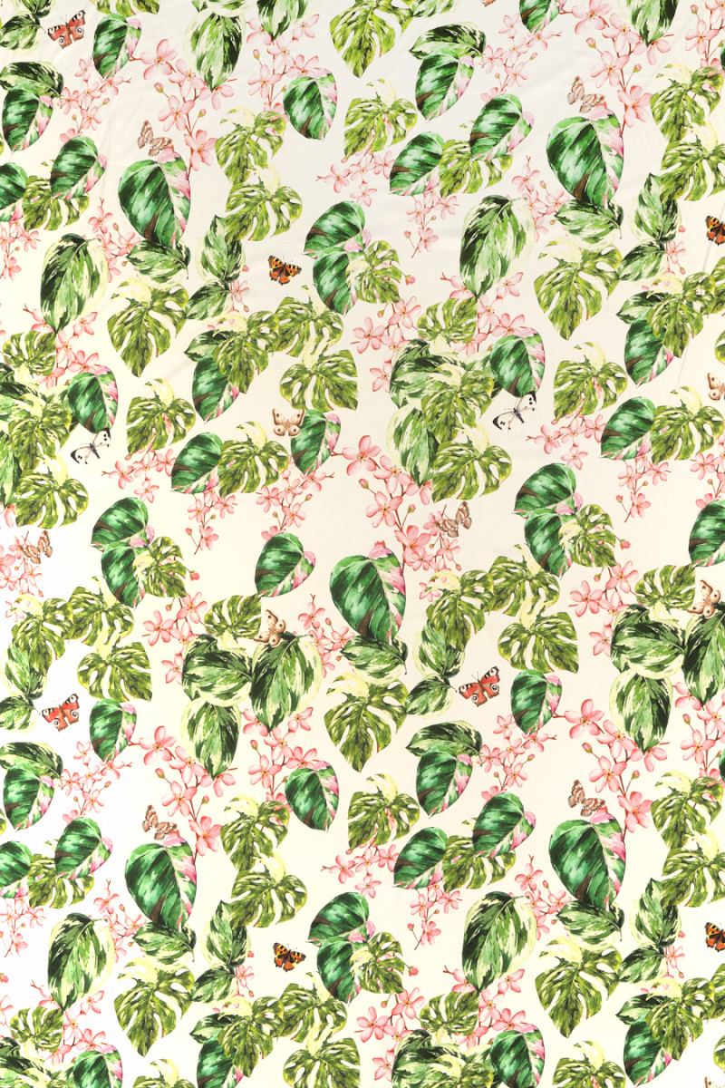 Olasz selyem szatén elasztán hozzáadásával, matt oldalán nyomattal. Nagyon érdekes motívum a nagy, zöld monstera levelekről, amelyeket kisebb, rózsaszín virágok vesznek körül. A színes pillangók motívumai finoman keverednek a mintába. Az egész écru háttér előtt készül. Gyönyörű egzotikus ajánlat azoknak, akik szeretik a növényi motívumokat. Az elasztán hozzáadása kényelmesebbé teszi a viseletet és kevésbé gyűrődik. Tökéletes eredeti ing, ruha vagy szoknya varrásához.