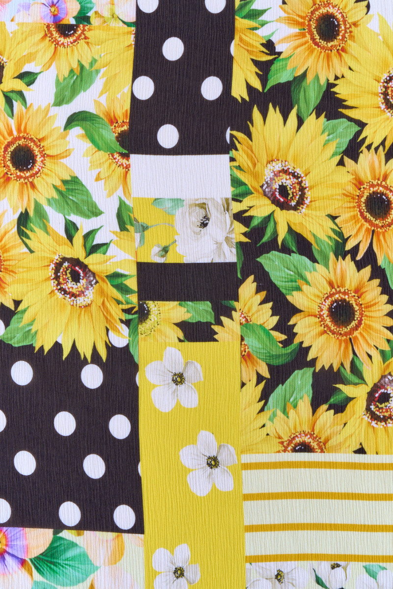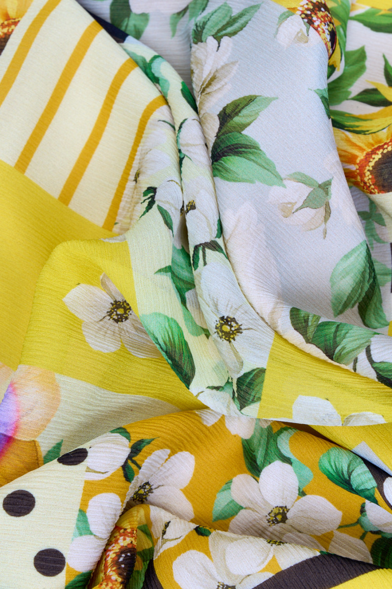 Olasz 100% selyem gyűrött sifon, virágmotívummal, patchwork formájában, domináns sárga színben elrendezve és fekete kontrasztban. A tiszta napraforgók és a finom árvácskák és rózsák, valamint a pontok és kötőjelek érdekes kombinációja az anyag eredeti mintáját hozza létre. A szövet könnyű, tágas, enyhén átlátszó, rugalmas - szálakon működik. Gyönyörű javaslat egyedi ruha, blúz vagy sál létrehozására.
