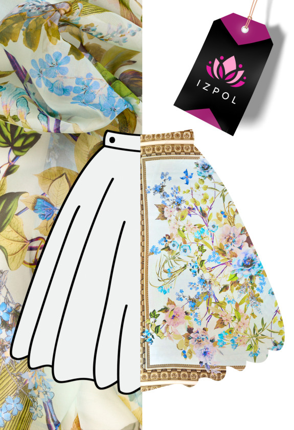Olasz 100% selyem muszlin, kék és krém virágok motívumával, világoskék alapon, gyönyörűen díszített keretben, ami a szövet eleganciáját adja. A szövet 140cm * 140cm méretű kuponokban kapható. A természetes selyem muszlin egy nagyon finom, tágas, átlátszó anyag, finom ragyogással, amely a selyemszövetekre jellemző. Tökéletes könnyű ruhákhoz, blúzokhoz, szoknyákhoz.