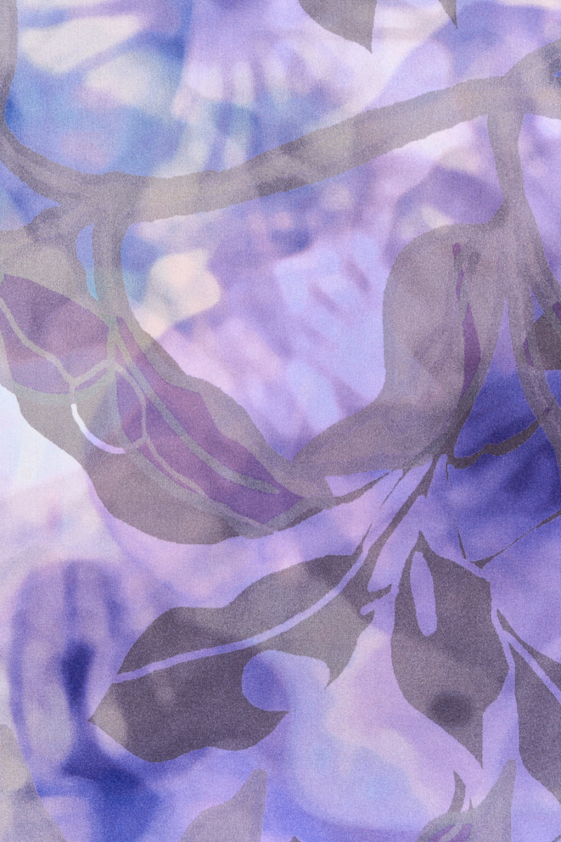 Olasz selyem szatén, elasztán hozzáadásával, árnyékos lila-kék alapon homályos szürke levelek vannak, amelyek az egyik szélén élesednek. A minta emellett nagyon világos lila színű ékezetekkel gazdagodik, amelyek óvatosan megvilágítják az egész anyagot. Az anyag puha, rugalmas és szépen illeszkedik. Ideális ajánlat visszafogott színekben azok számára, akik szeretik az elegáns és időtlen színkombinációkat.