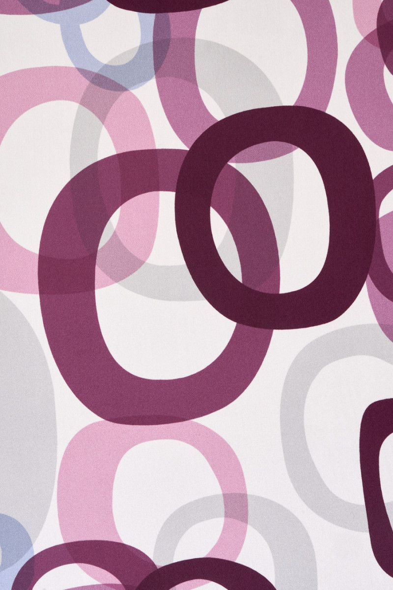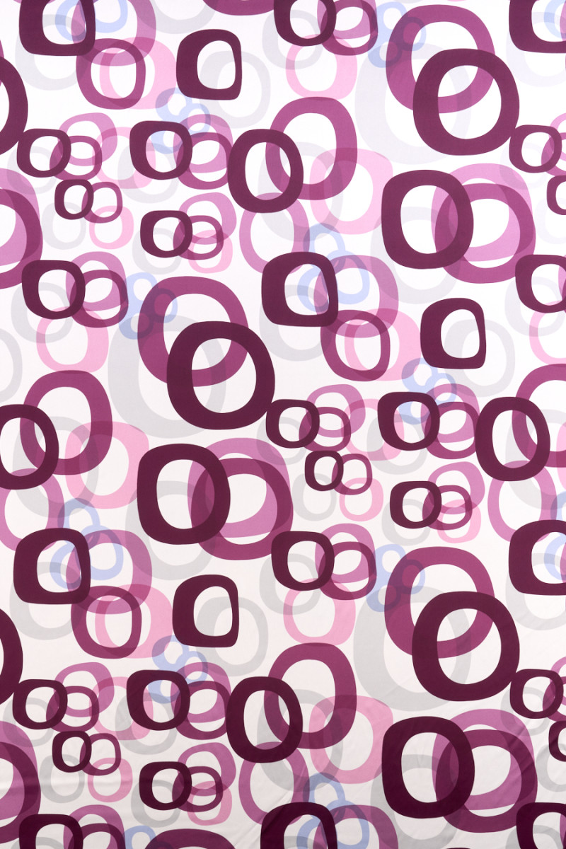 Olasz selyem szatén elasztán hozzáadásával, cékla, rózsaszín és szürke színű szabálytalan körök motívumával, fehér alapon. A szövet rugalmas, áramló, finom tapintású, puha és átlátszatlan. Az elasztán hozzáadása kényelmesebbé teszi a viselést és kevésbé ráncol. Különböző méretű, sűrűn elhelyezett geometriai minták, a legnagyobb kör 19 cm * 20 cm, a legkisebb 6 cm * 6 cm. Érdekes javaslat eredeti ing, ruha vagy szoknya létrehozására.