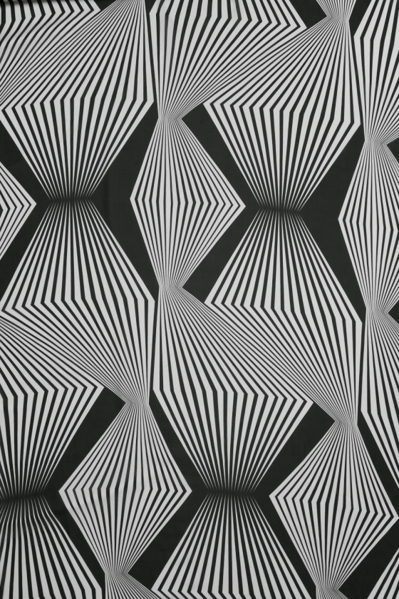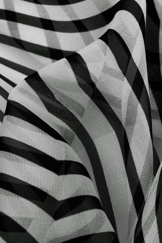 Olasz sifon 100% selyem, fekete-fehér geometriai nagy mintákkal. A szövet tágas, könnyű, átlátszó és matt. Egy divatmárka jól ismert gyűjteményéből származik. A sifon tökéletes tágas ruha, szoknya, valamint ing vagy blúz varrására.