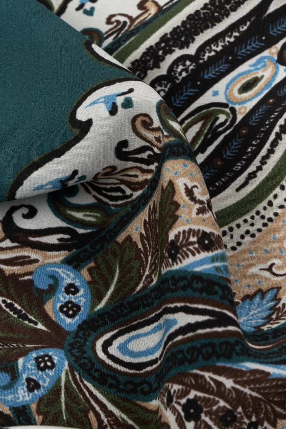 Olasz 100% selyem krepp kékeszöld színben, érdekes, keleti mintával, semleges színekben. Az anyag 120 cm * 135 cm méretű kuponokban kapható. A szövet tágas, finom tapintású és nem rugalmas. Eredeti javaslat, amelyből szoknyát, ruhát, blúzt és sálat készíthet.