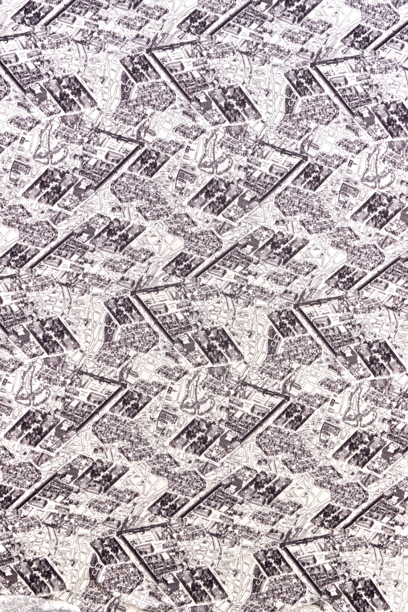 Olasz selyemszövet várostervi motívummal, fekete színben, fehér alapon. Sűrű minta, amely épületeket, utcákat, tereket ábrázol nevükkel. Szövet jacquard szerkezettel - keskeny csíkok egészében, rugalmatlan, matt, enyhén merev, tapintásúan hasonlít a pamutra. Érdekes javaslat, amelyből blúzokat, ingeket, ruhákat és szoknyákat hozhat létre.