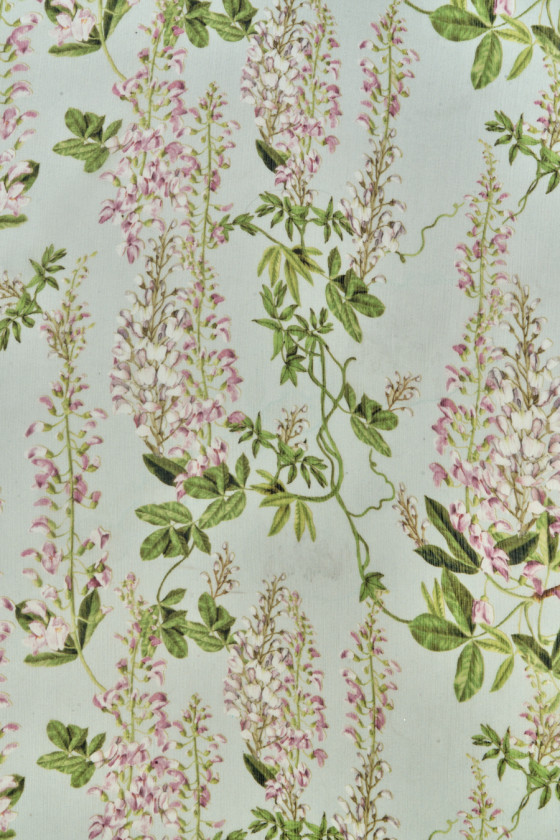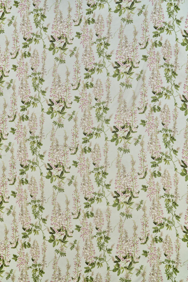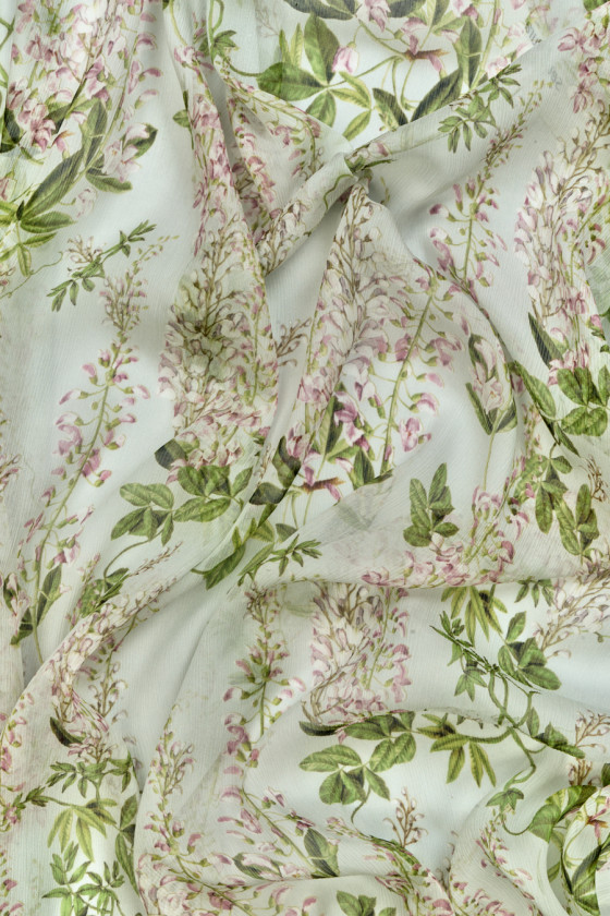 Olasz sifon 100% selyem, gyűrött kis virágok, szárak és levelek motívumával, nagyon könnyű, akvamarin alapon. Finom minta, elég sűrűn elhelyezve a virágok és a zöld levelek és szárak heather rózsaszín színében. A szövet átlátszó, nem rugalmas, matt és tágas. Tökéletes ruhákhoz és blúzokhoz, sallangokkal.