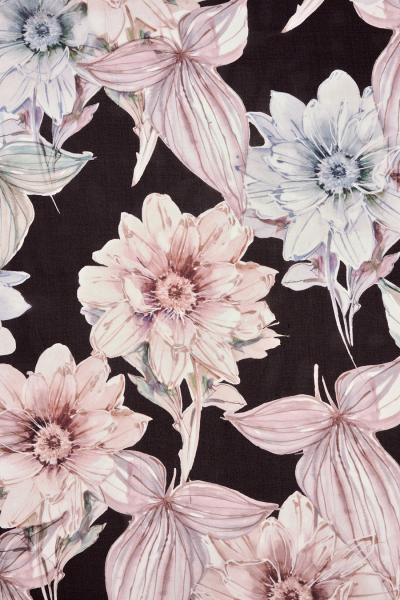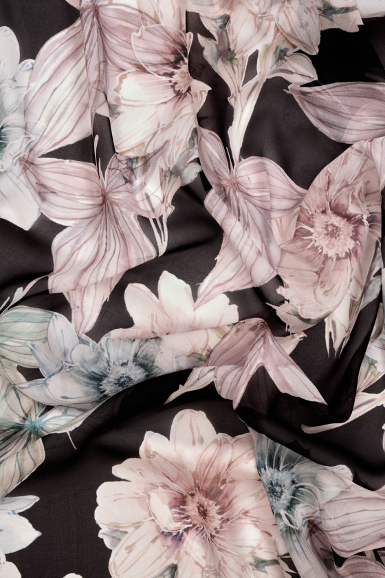 Olasz sifon 100% selyem, nagy virágokkal, pasztell színekben, fekete alapon. Sűrű, ismétlődő minta világos rózsaszín, kék, zöld árnyalatokban, 18cm * 19cm méretű virágokban. A szövet könnyű, tágas, kissé átlátszó és egy jól ismert divattervező gyűjteményéből származik. Gyönyörű javaslat ruha, blúz vagy szoknya létrehozására romantikus kiadásban.