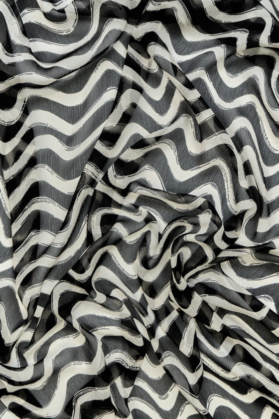 Az olasz sifon 100% selymet gyűrött fehér hullámok motívumával fekete alapon. Sűrű, ismétlődő minta 2 cm-enként. A szövet könnyű, tágas, átlátszó és egy jól ismert divattervező gyűjteményéből származik. Érdekes javaslat ruha, blúz vagy szoknya létrehozására.