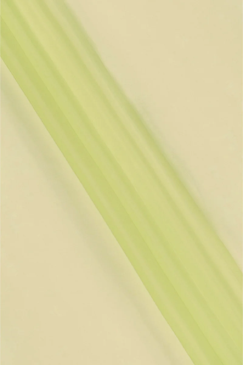 Olasz 100% selyem organza szövet lime zöldben. A természetes selyemorganza vékony, átlátszó, de merev anyag, finom ragyogással, amely a selyemszövetekre jellemző. Tökéletes ruha, blúz, ing, szoknya varrásához.