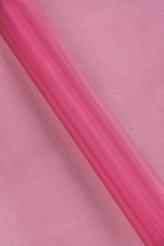Olasz 100% selyem organza szövet fukszia színben. A természetes selyemorganza vékony, átlátszó, de merev anyag, finom ragyogással, amely a selyemszövetekre jellemző. Tökéletes ruha, blúz, ing, szoknya varrásához.
