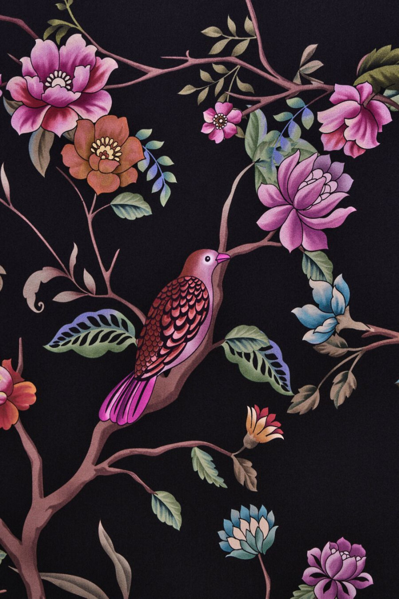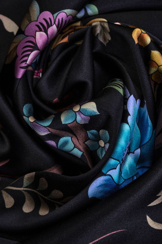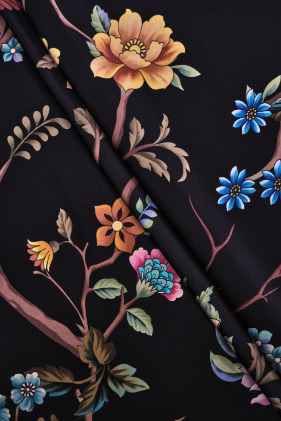 Olasz selyem szatén, elasztán hozzáadásával, meglehetősen sűrű motívummal, barna ágakkal, színes virágokkal és madarakkal díszítve fekete alapon. Virágok és madarak rózsaszín, lila és finomabb narancssárga energikus árnyalataiban. A szövet áramló, puha, rugalmas és gyönyörűen fényes, ami egyedülálló eleganciát kölcsönöz neki. Tökéletes tágas ruhákhoz, szoknyákhoz, valamint blúzokhoz és ingekhez.
