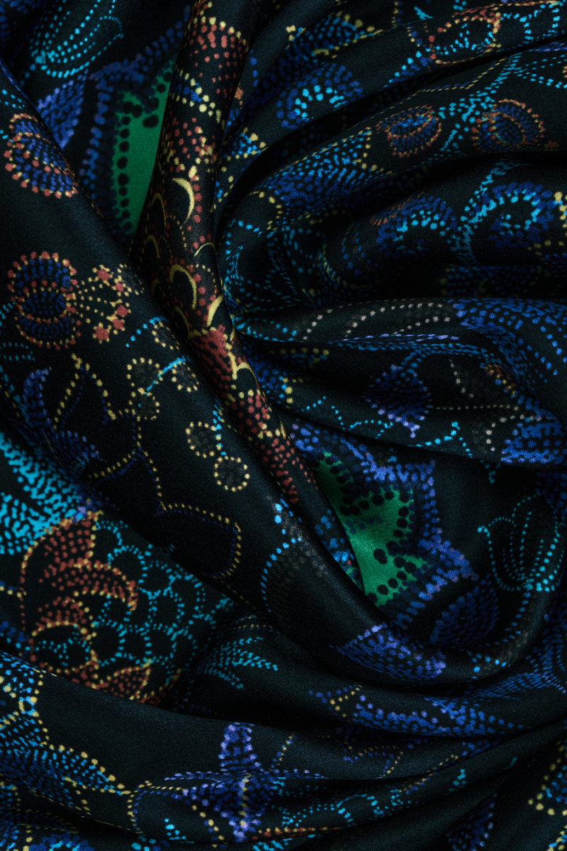 Olasz szatén 100% selyem, keleti virágok motívumával fekete alapon. Sűrű minta, amely a búzavirág, a narancs, a zöld és a türkiz meglehetősen világos árnyalataiban készült, apró pontok formájában, amelyek érdekes, keleti növényzetet hoznak létre. A szövet áramló, puha, nem rugalmas és gyönyörűen fényes, ami egyedülálló eleganciát kölcsönöz neki, és egy jól ismert divattervező gyűjteményéből származik. Érdekes javaslat, amely jól működik a tágas ruhákkal, szoknyákkal, valamint blúzokkal és ingekkel.