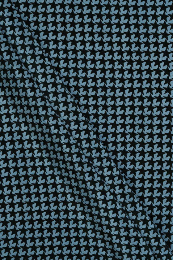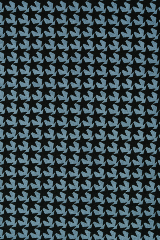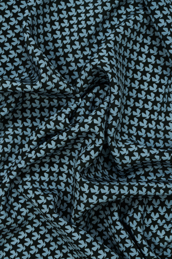 Olasz 100% selyem krepp, kék alapon kis fekete csillagok motívumával. Szabályos és sűrű kialakítás, ahol egy csillag 1,4 cm * 1,4 cm. Az anyag könnyű, vékony, nem rugalmas, matt és lágyan drapériák. Tökéletes blúzokhoz, ingekhez és tágas ruhákhoz és szoknyákhoz.