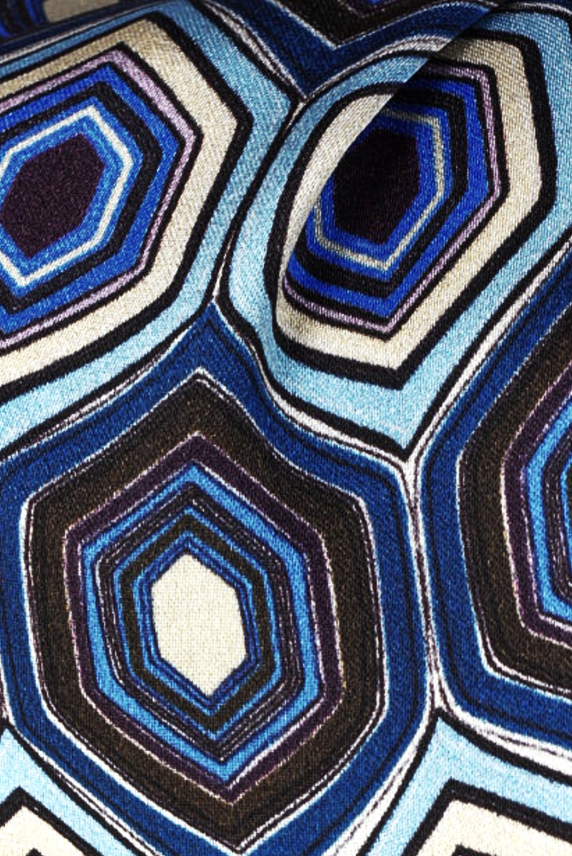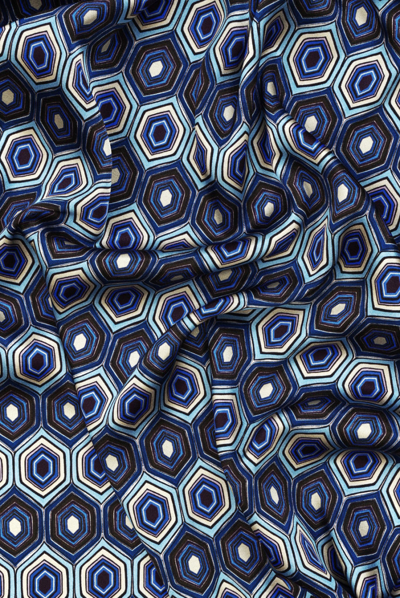 Olasz selyem szatén elasztán hozzáadásával, egymás mellé helyezett hatszögekből álló grafikai motívummal. Az egész minta kék, bézs, búzavirágkék és sötétbarna színben készült. Egy darab 3,5 cm * 4,5 cm. Az anyag folyós, rugalmas, átlátszatlan, puha és gyönyörű fényű. Érdekes ajánlat, amely tökéletes lesz ingekhez, blúzokhoz, tunikákhoz és még lazább nadrágokhoz.