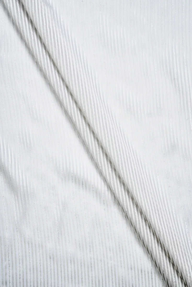 Olasz devore selyemszövet keskeny csíkok motívumával, függőlegesen világosszürke színnel. A sifon csíkok 0,3 cm szélesek, a szatén hevederek pedig 0,2 cm szélesek, ráadásul az anyagot ezüst, fényes lurex szál díszíti. Az anyag vékony, enyhén átlátszó, folyékony, könnyű és rugalmatlan. Tökéletes lesz ruha, blúz, ing vagy szoknya varrásához.