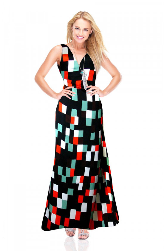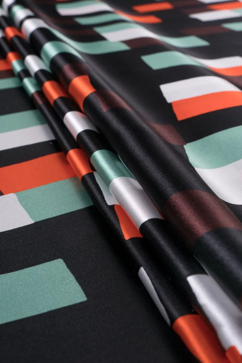Gyönyörű mintás szatén természetes selyemből, egy jól ismert divattervezőtől. Színek: színes téglalapok (fehér, menta és narancssárga) fekete alapon