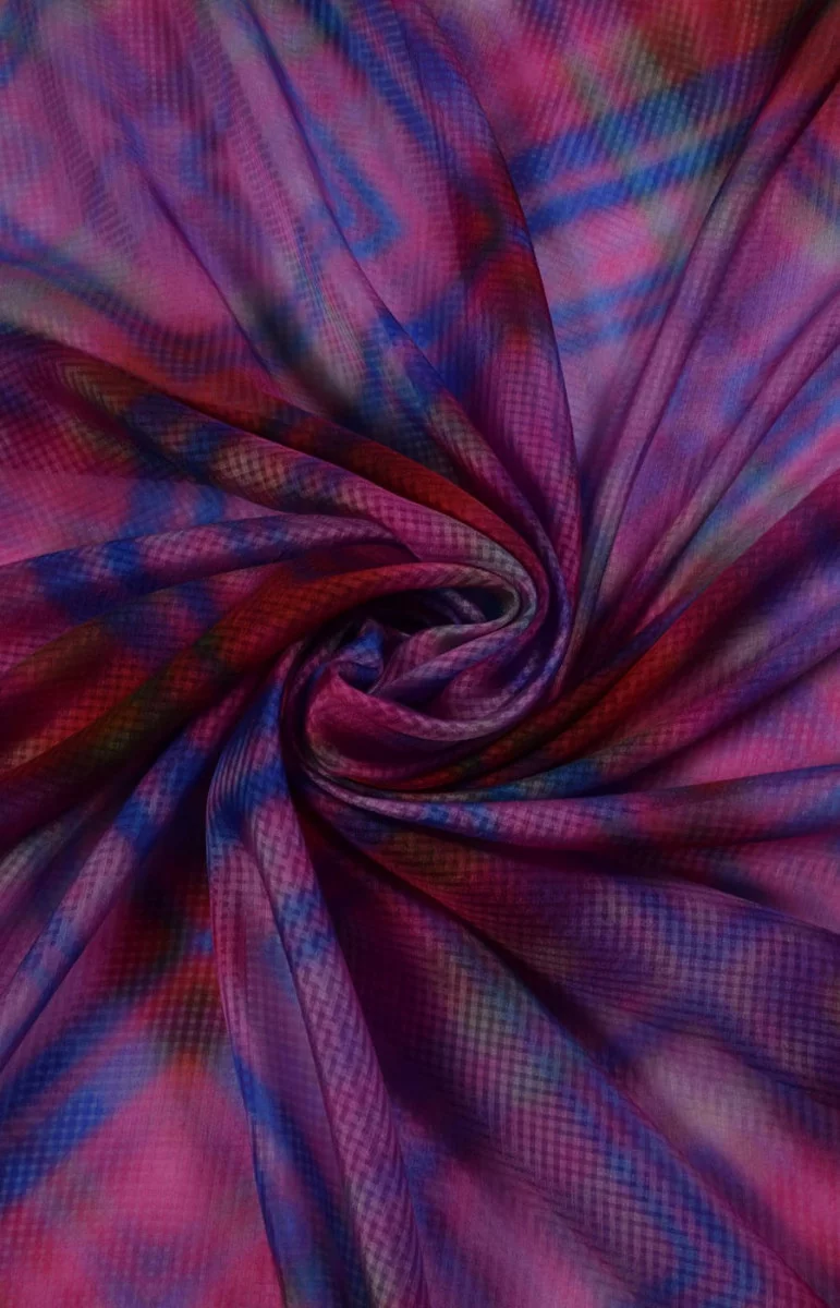 Selyem habotai mintás, tágas, finom, átlátszó (javasoljuk, hogy bélést vásároljon). Használható szellős ruhák, blúzok, szoknyák elővarázsolására. Kis rácsszerkezet, színek: rózsaszín, piros, búzavirág, zöld.