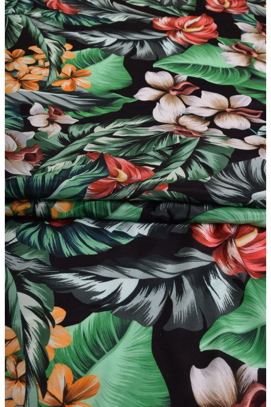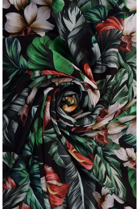 Az elasztánnal ellátott selyem krepp finom anyag, bársonyos tapintású, félig átlátszó. Dzsungel nyomtatás, levegős ruhákat, finom blúzokat, pareókat varázsolhat. Javasoljuk, hogy bélést használjon.