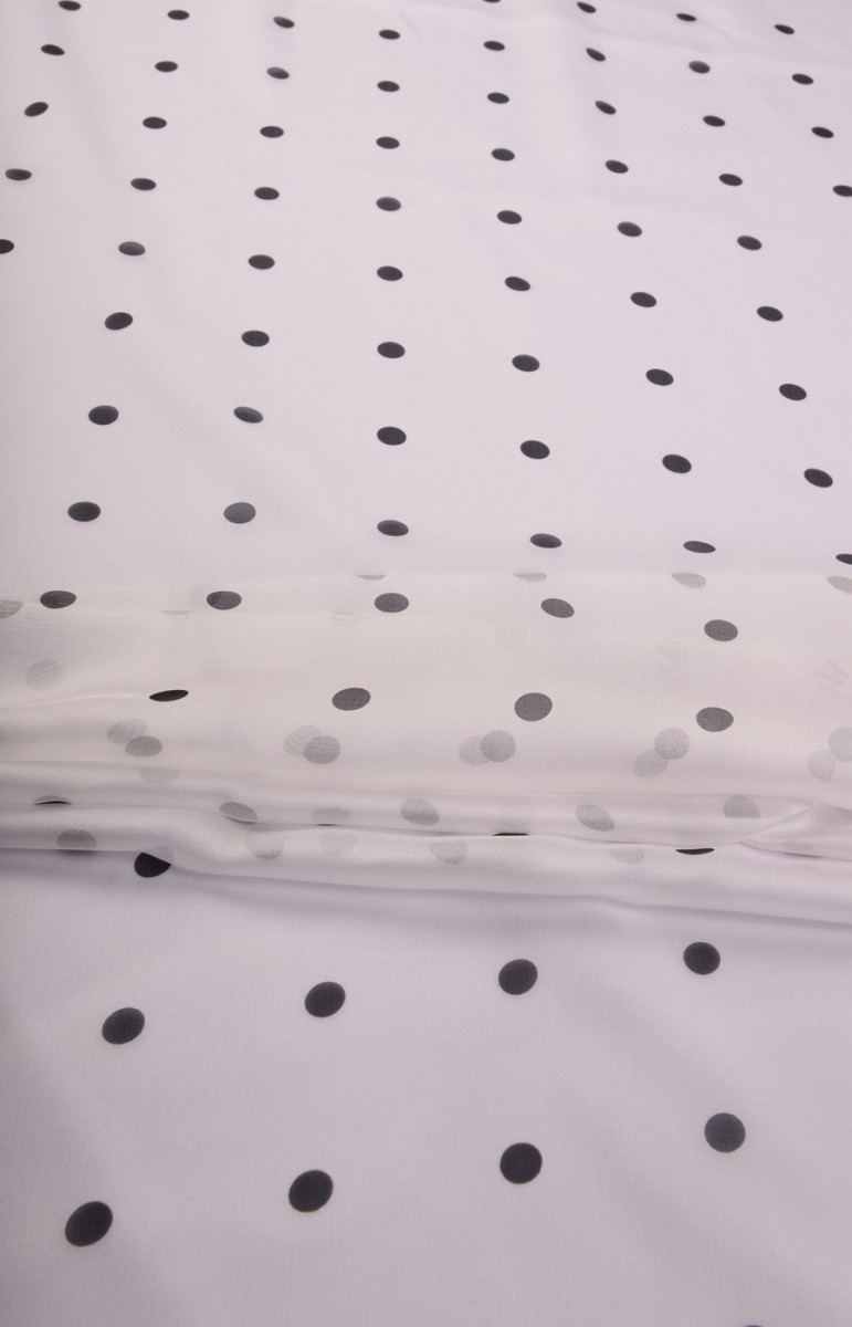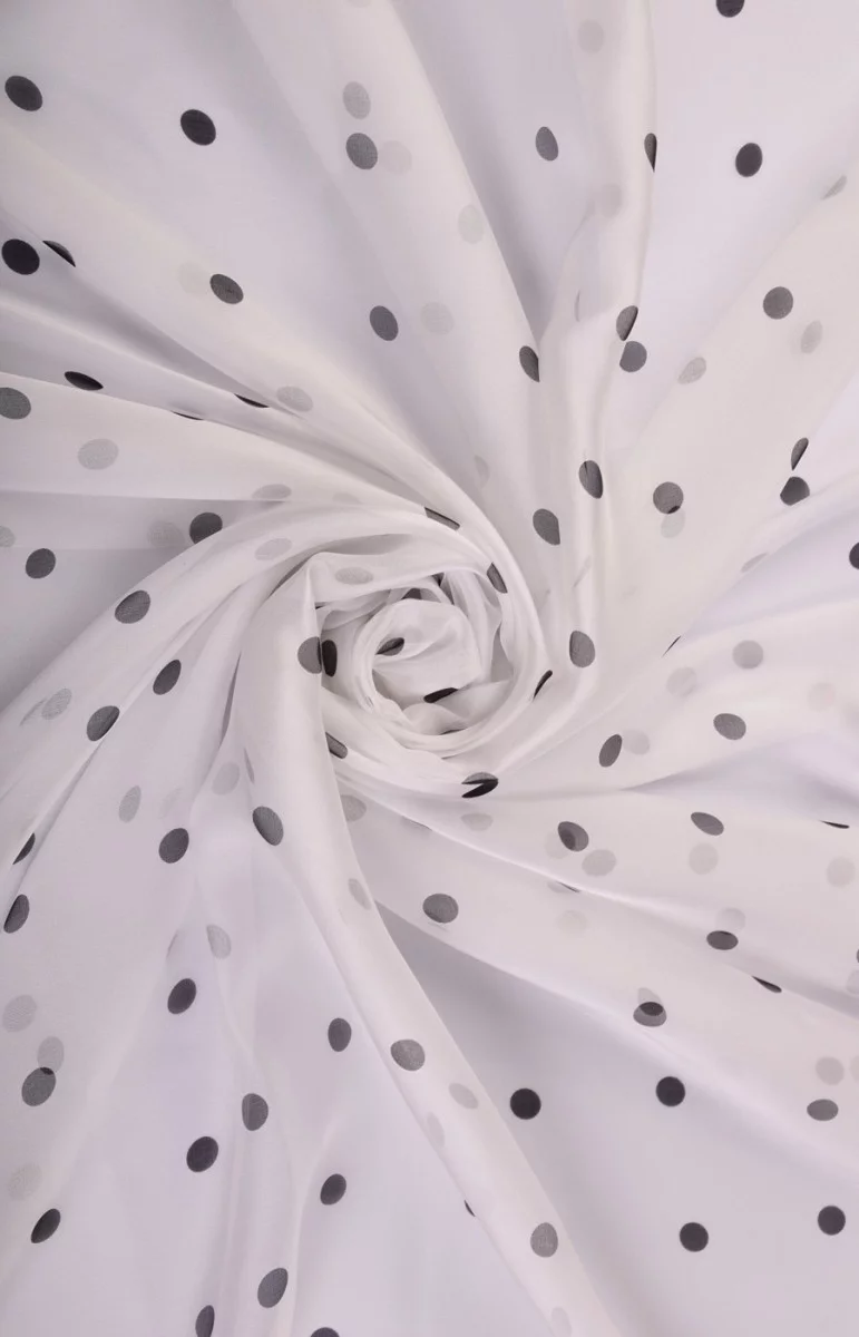 A selyem sifon nagyon finom, tágas és átlátszó anyag. Tökéletes tágas ruhákhoz és blúzokhoz. Nem rugalmas anyag. Színek: fekete pöttyök ecru alapon