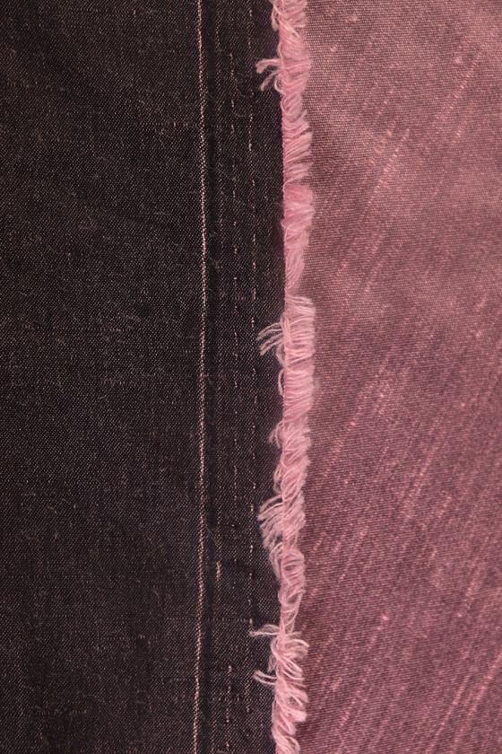 Kéthangú viszkóz (rózsaszín és fekete szál) ala shantung, klasszikus, elsődleges szövéssel, "barbs" -val. Puha szövet, műanyag szerkezetű. Az antik rózsaszín színe.