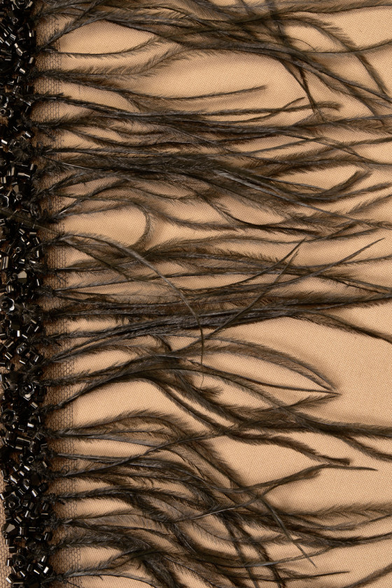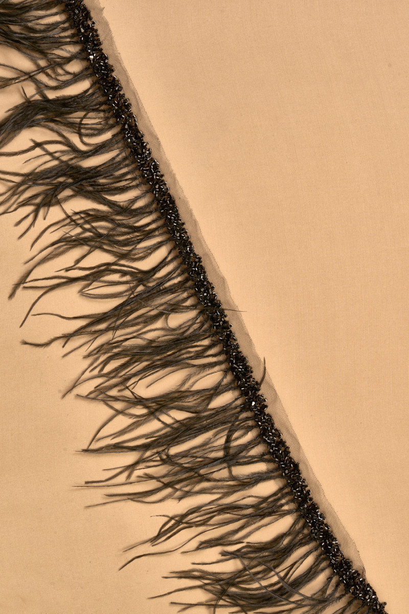 Exkluzív olasz szalag fekete színben, sűrűn díszítve fekete gyöngyökkel és fekete tollakkal. A tüllre helyezett gyöngyök 1,5 cm szélesek, a finom tollak nem egyenletesen hosszúak, 9 cm és 16 cm között. Nagyon elegáns javaslat egy ruha vagy blúz díszítésére. Szalag az időtlen fekete rajongóinak, modern csavarral.