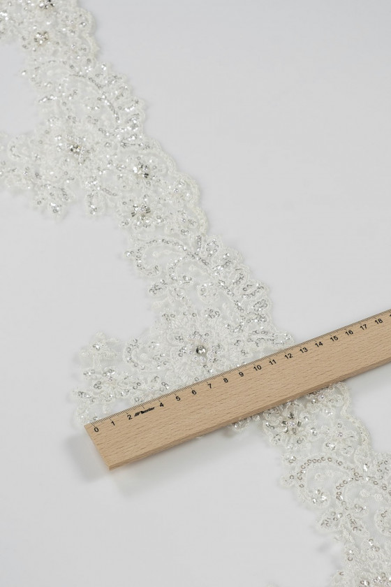 1Olasz csipkeszalag fehér színben, egyik oldalán fogakkal. Virágmotívum, gazdagon hímzett gyöngyökkel és flitterekkel fehér és ezüst színben.