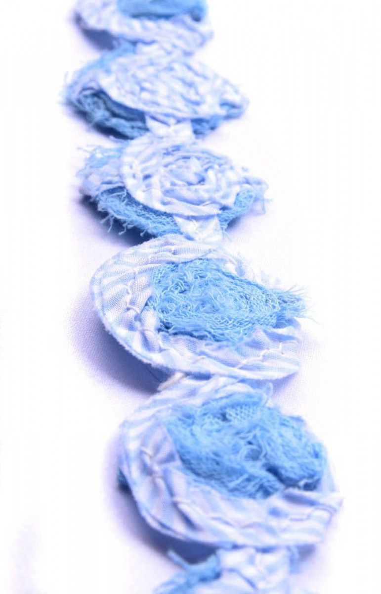 Érdekes rövidáru szalag fehér és kék színben kiegészítőkhöz vagy befejezésekhez. A szélesség kb. 3 cm.